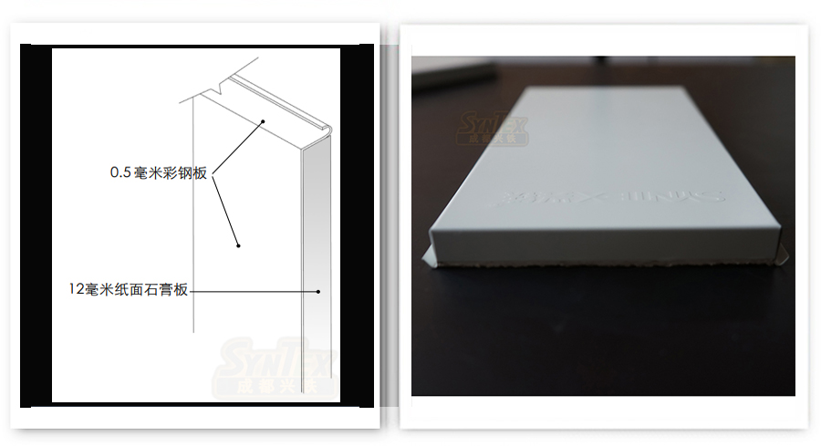 興鐵C系列機房彩鋼板,也叫CLOUD系列,表面材是白色預(yù)涂熱鍍鋅鋼板(雙面鍍鋅量60-80g),鋼板符合GB/T 12754標準的規(guī)定。具備良好的抗氧化、抗拉強度等性能。背面復(fù)合杰森品牌紙面石膏板(12mm),滿足防火、隔音、保溫及強度需求。